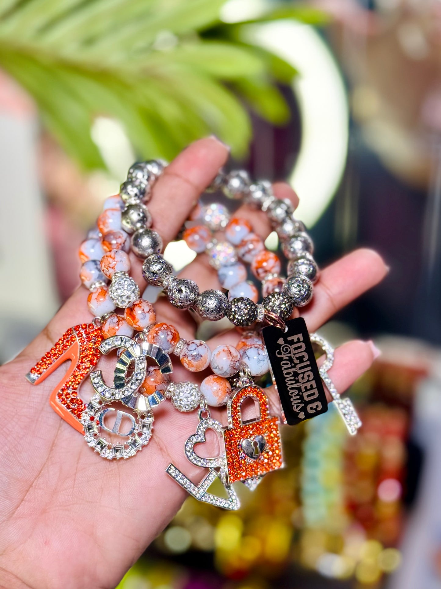 Neutral silver and marble beads with pops of fiery orange, heart-lock and “love” charms—this stack is for the girl who’s locked in on her goals and her glam. Perfect for workdays, date nights, and every moment you want your wrist to scream focused, polished, and unbothered. 🧡✨