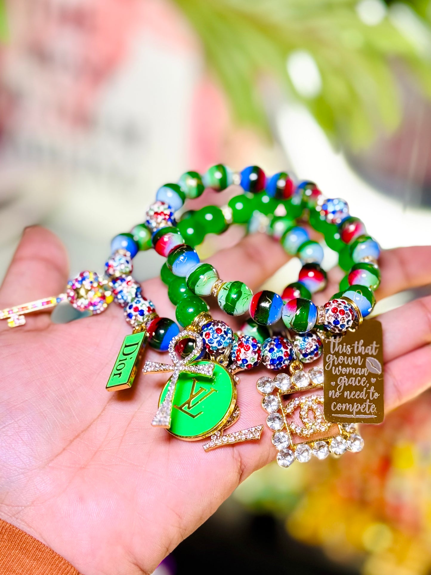 Rich green and multicolor beads meet sparkling gold charms and a “grown woman grace” quote tag—perfect for the girl who moves with confidence, class, and zero competition. Slip this on when you want your wrist to quietly say, I’m in my own lane. 💚✨