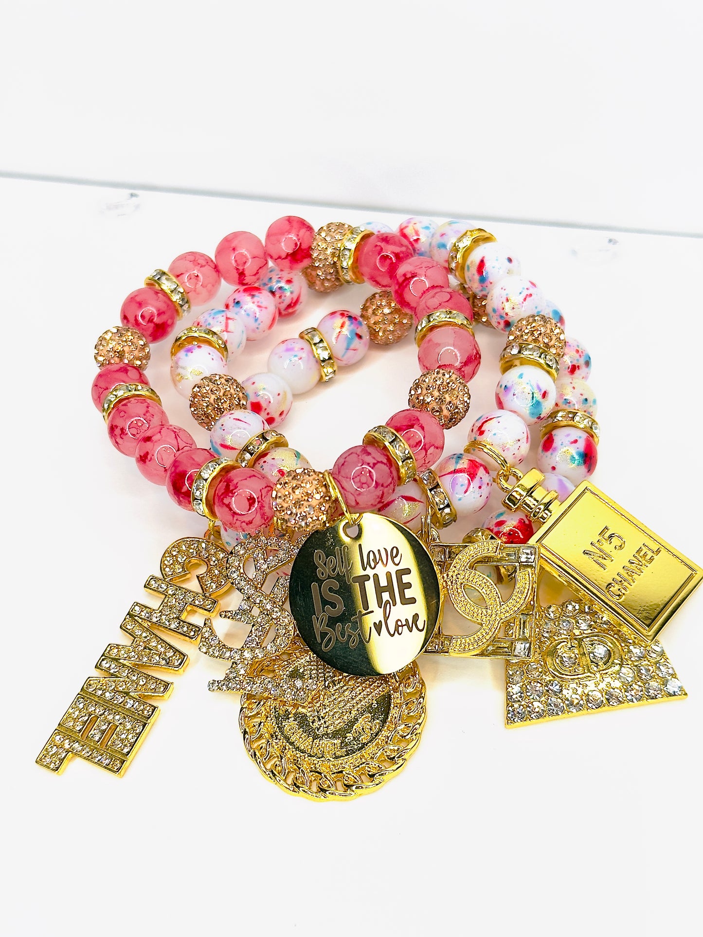 Three handcrafted beaded bracelets with decorative spacers and mixed designer inspired charms. 💫
