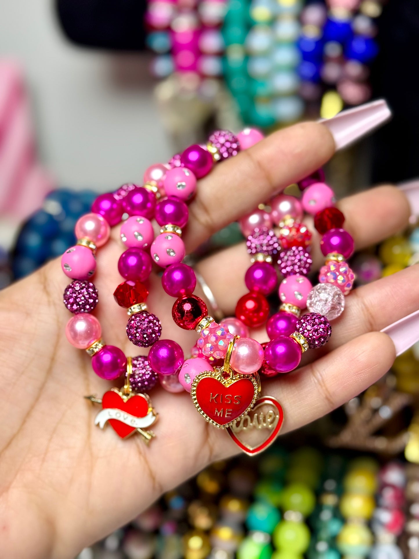 A bold mix of hot pink pearls, sparkle beads, and playful heart charms 🍬✨ Eye Candy Mini is sweet, flirty, and impossible to ignore. A statement mini made for pretty-girl moments.