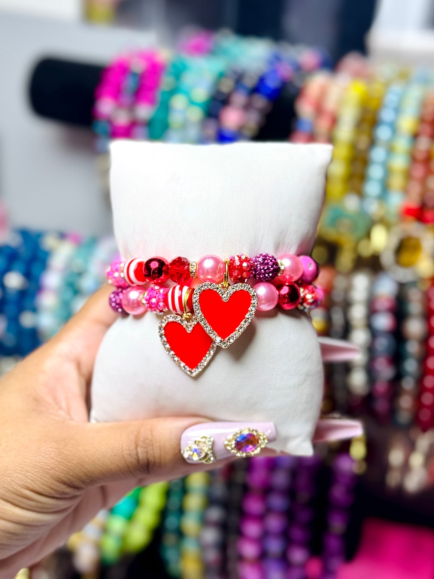 A playful mix of pink pearls, ruby sparkle, candy-stripe beads, and crystal-trim heart charms 🍬✨ Sugar Rush Mini is sweet, bold, and made for the girl who loves her love loud. Fun, flirty, and full of Valentine vibes.